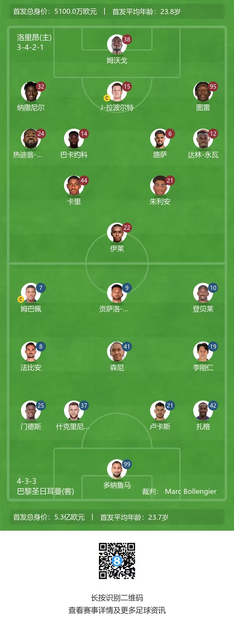 巴黎首发:99-多纳鲁马、42-扎格、21-卢卡斯-埃尔南德斯、37-什克里尼亚尔、25-努诺-门德斯、8-法比安、19-李刚仁、41-马尤卢、10-登贝勒、7-姆巴佩、9-贡萨洛-拉莫斯